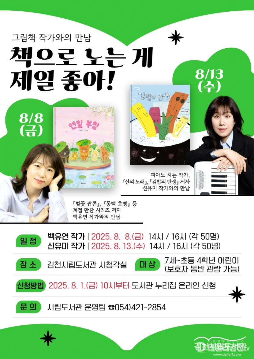 김천시립도서관(관장 이신기)은 오는 8월에 그림책 작가와 어린이 독자들이 직접 만나 소통하는 프로그램인 「책으로 노는 게 제일 좋아!」를 운영한다.