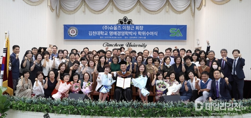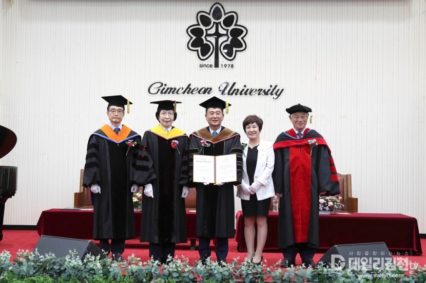 김천대학교(총장 윤옥현)는 26일 오후 2시 그레이스홀에서 명예박사학위 수여식을 개최하고 ㈜슈올즈 이청근 회장에게 명예경영학박사학위를 수여했다. 이날 명예박사학위 수여식에는 최명희여사 등 가족들과 학계 및 재계인사 그리고 대학 교직원 등 많은 인사들이 참석해 축하했다.