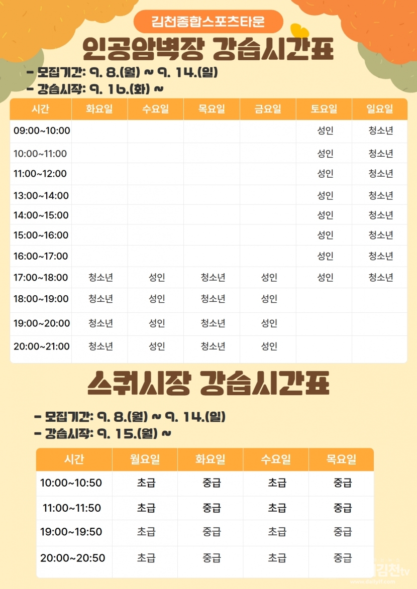 인공암벽장은 이달 16일부터 강습이 시작되며, 평일 각 4개반(17:00~21:00)과 주말 각 8개반(09:00~18:00)을 개설하여 반별로 10명씩 모집한다.