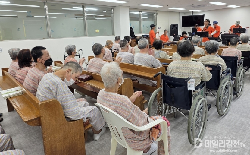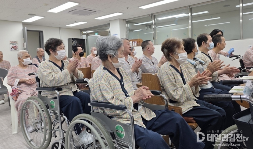 김천시니어클럽 소속 시니어열차문화예술단(지도 강정희)이 9일 오후 2시 30분부터 1시간 동안 경상북도립김천노인전문요양병원 2층 다목적 프로그램실에서 어르신들을 위한 특별한 음악회를 열었다.