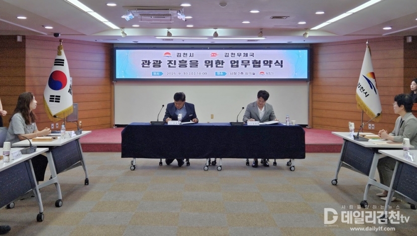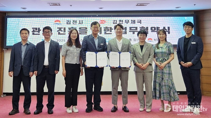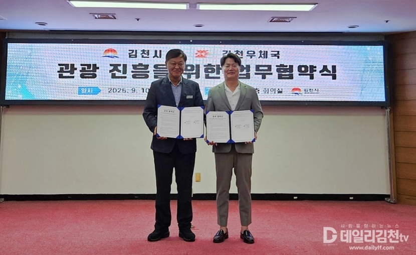 김천시와 김천우체국은 지난 10일 김천시청에서 지역 관광진흥을 위한 업무협약을 체결했다. 이날 협약식에는 윤상영 경제관광국장, 김상호 김천우체국장을 비롯한 양 기관 관계자들이 참석해 관광진흥 상호 협력 방안을 함께 논의했다.