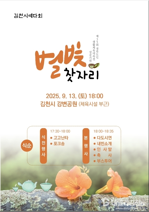 경북도민생활체육대축전의 성공을 기원하는 특별 문화행사 「별빛찻자리」가 오는 13일 저녁 6시부터 9시까지 김천강변공원 일원에서 열린다.