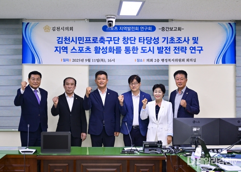 김천시의회 스포츠지역발전연구회(배형태·진기상·정재정·박복순 의원)는 지난 11일 행정복지위원회 회의실에서 '김천시민프로축구단 창단 타당성 기초조사 및 지역 스포츠 활성화를 통한 도시 발전 전략 연구'의 중간보고회를 개최했다.