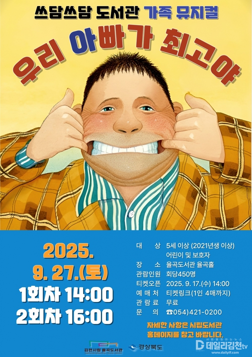 김천시립 율곡도서관(관장 이신기)은 오는 27일 오후 2시와 4시, 두 차례에 걸쳐 율곡도서관 율곡홀에서 가족 뮤지컬 「우리 아빠가 최고야」를 공연한다고 밝혔다.