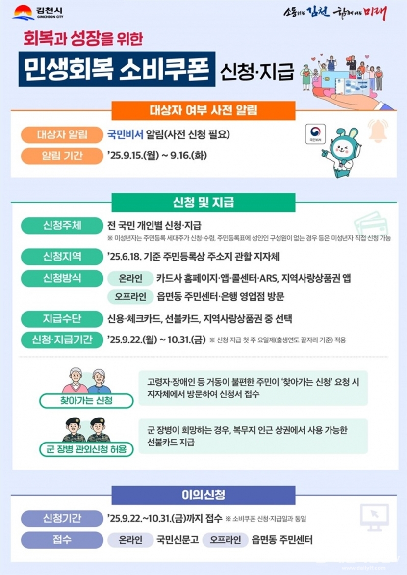 개천절 및 추석 연휴 기간(10.3.~10.9.)에는 읍면동 행정복지센터 또는 카드와 연계된 은행영업점은 운영하지 않으므로 신청이 불가하다. 다만 온라인 신청은 정상 운영된다. 소비쿠폰의 사용기한은 올해 11월 30일까지로 김천시 내 연 매출 30억 원 이하 소상공인 매장에서 사용할 수 있으며 기한 내 사용하지 않을 경우 자동 소멸된다.