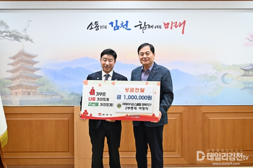 배낙호 김천시장은 “우리 지역의 복지 증진을 위해 지속적으로 힘써주시는 국제라이온스클럽 경북지구 조석현 총재님과 관내 클럽 회장단분들에게 깊이 감사드린다”라며, “따뜻한 마음이 담긴 기부금은 지역 발전과 시민 복지를 위해 소중히 사용하겠다”라고 전했다.