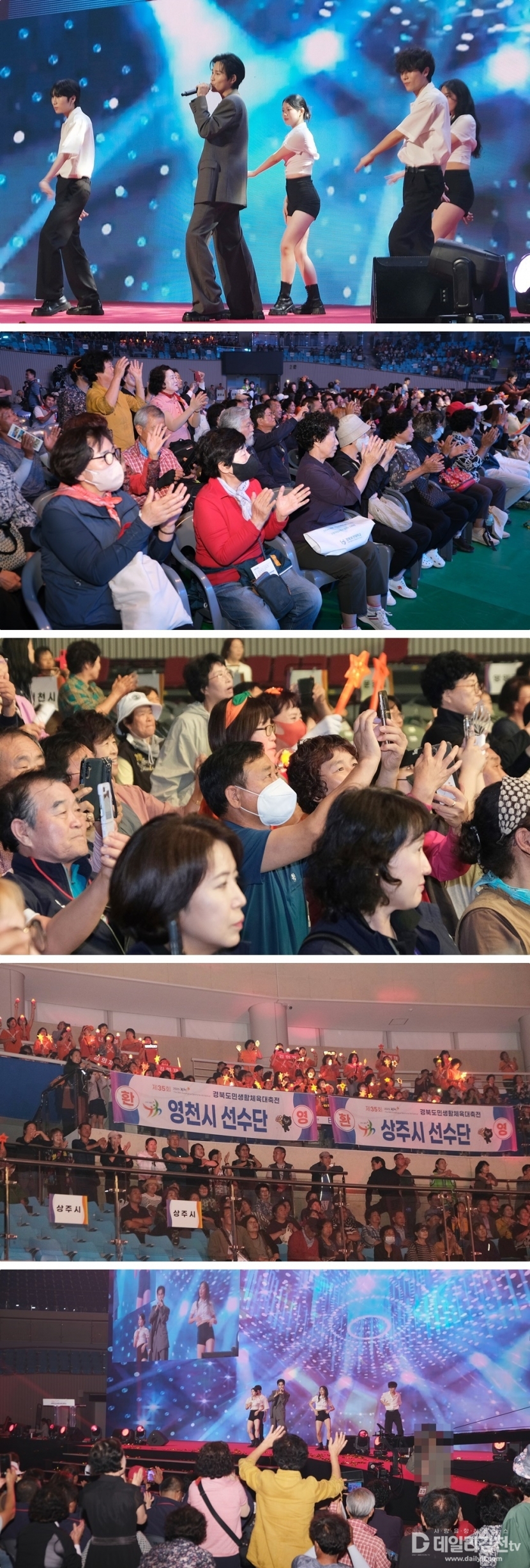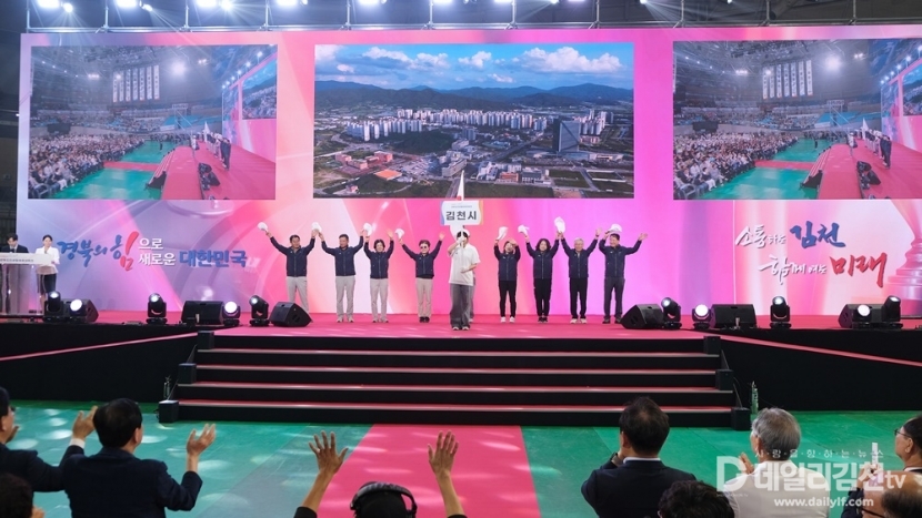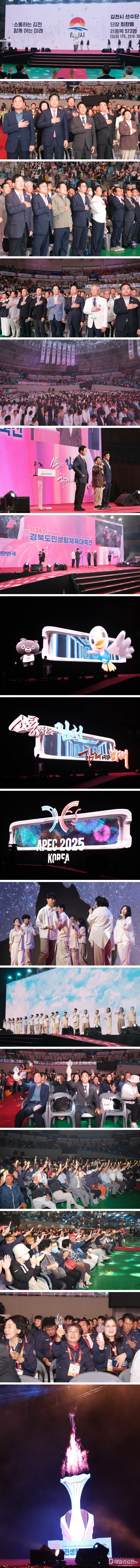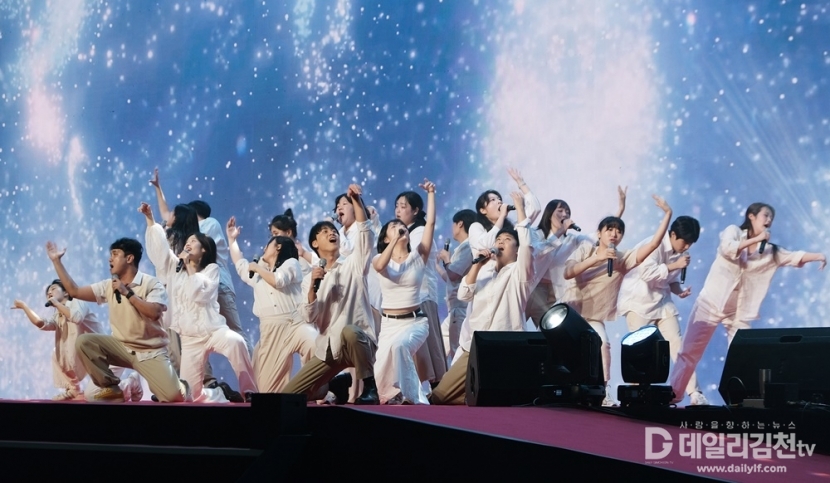 이어진 주제공연은 세 장으로 구성돼 관람객들의 시선을 사로잡았다. 1막에서는 김천과 경북의 미래를 담아낸 아나모픽 영상이 초대형 LED 전광판을 통해 입체적으로 펼쳐졌고, 2막에서는 ‘희망의 하모니’를 주제로 한 쇼콰이어 공연이 대회의 의미를 한껏 높였다. 마지막 장에서는 LED 성화응원봉을 활용한 성화 퍼포먼스가 장내를 뜨겁게 달구었다.