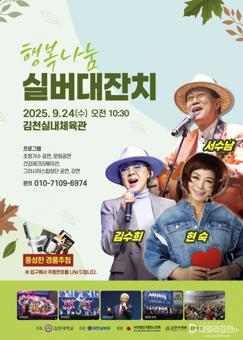 김천대학교(총장 윤옥현)는 오는 24일 오전 10시 30분 김천실내체육관에서 지역 어르신 약 5,000여 명을 대상으로 2025 행복나눔 실버 대잔치를 개최한다고 밝혔다.
