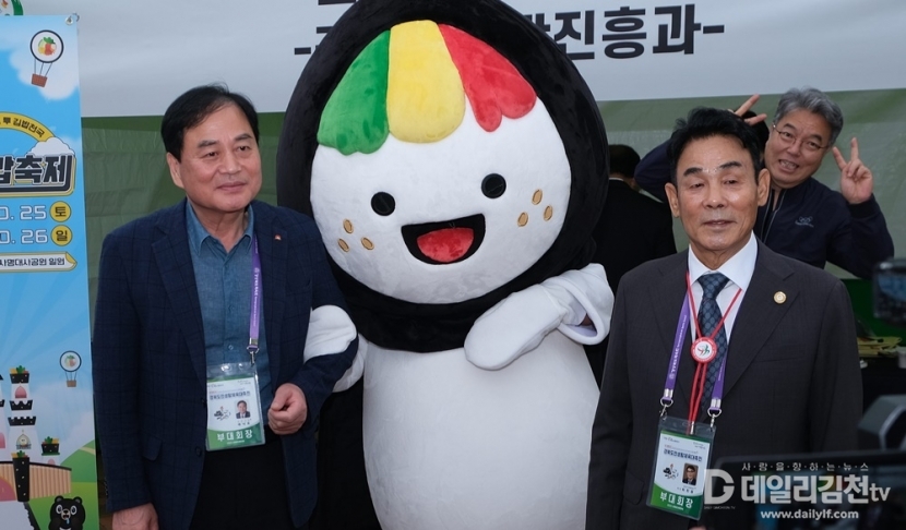 | 10월 25일 열릴 김밥축제의 마스코트 꼬달이와 기념사진을 찍는 배낙호 김천시장(왼쪽)과 최한동 김천시체육회장 |