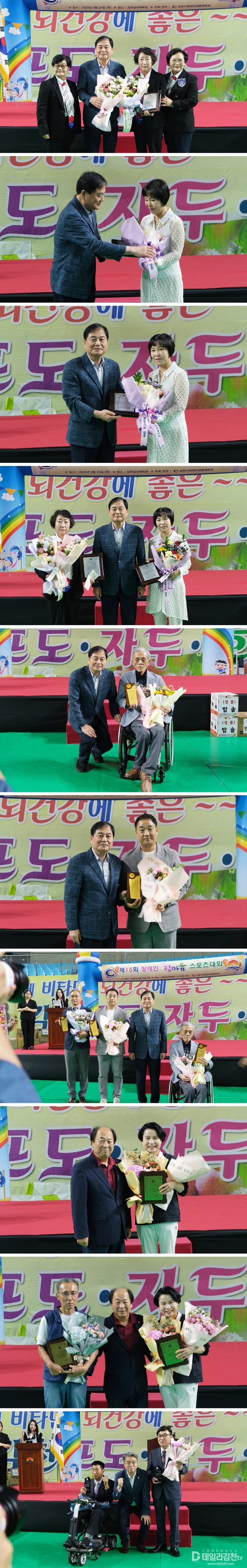 특히 이날 행사에서는 장애인 체육 발전과 권익 증진에 기여한 9명의 유공자가 표창을 받았다. 수상자는 ▲권정원(대한한궁협회 김천시한궁협회 교문) ▲박현숙(참빛봉사회 사무국장) ▲이병율(한국척수장애인협회 김천시지회장) ▲김진옥(용인대백호태권도장 관장) ▲경북보건대 보건복지과 ▲강정남(경북장애인부모회 김천시지부) ▲정용호(경북뇌병변장애인인권협회 김천시지회) ▲전종철(한국농어촌장애인협회 김천시지회) ▲송우규(경북시각장애인협회 김천시지회) 등이다.
