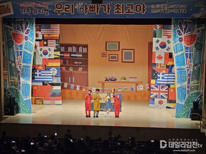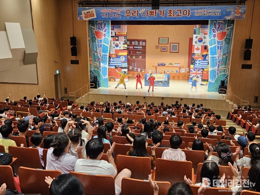 김천시립 율곡도서관(관장 이신기)은 지난 27일 율곡도서관 율곡홀에서 가족 뮤지컬 「우리 아빠가 최고야」를 성황리에 개최했다. 이날 공연에는 900여 명의 어린이와 가족 관객들이 참석하여 웃음과 감동을 나누고, 행복한 가족의 추억을 더하는 소중한 시간을 가졌다.