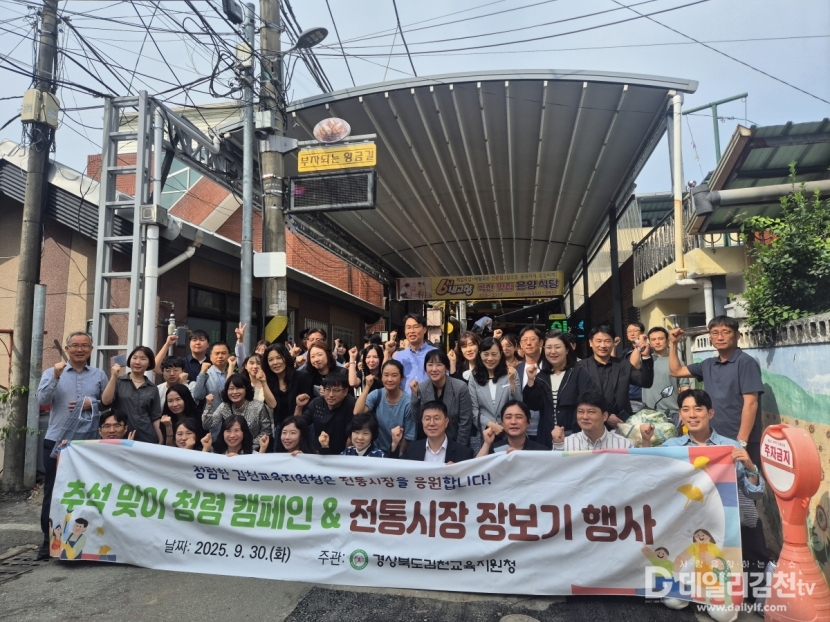 경상북도김천교육지원청(교육장 모태화)은 2025년 추석 명절을 앞두고 9월 30일(화) 황금시장에서 ‘추석맞이 전통시장 장보기 행사’를 실시하였다. 이번 행사는 물가 안정과 지역경제 활성화를 도모하는 동시에, 청렴한 공직문화를 확산하고 상생의 가치를 실천하기 위해 마련됐다.