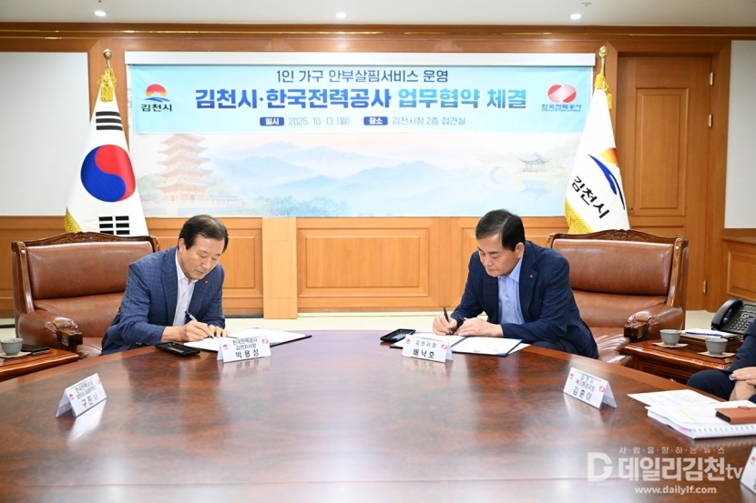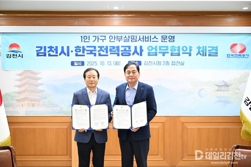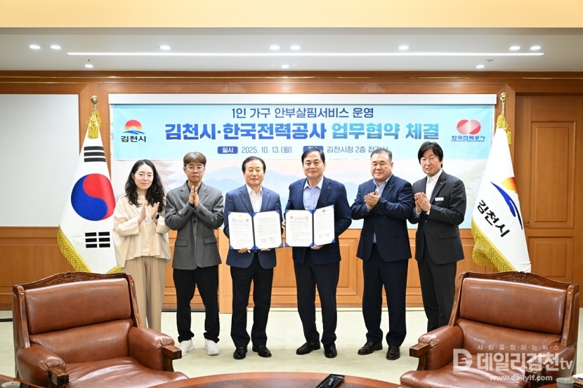 김천시(시장 배낙호)는 지난 13일 한국전력공사 대구본부 김천지사(지사장 박용성)와 함께 ‘1인 가구 안부살핌서비스 「든든e살핌」’ 업무협약을 체결했다.