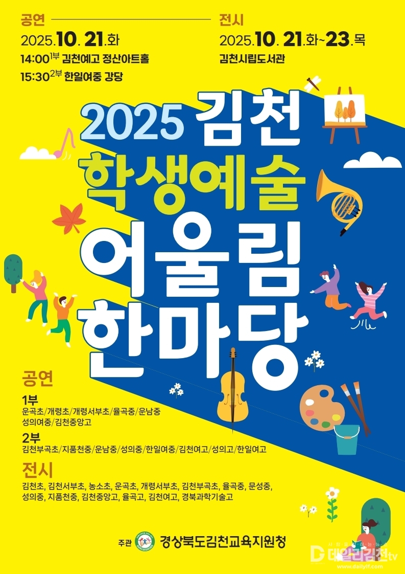경상북도김천교육지원청(교육장 모태화)은 오는 21일 김천예술고등학교와 한일여자중학교에서 공연 행사를 열고, 김천시립도서관에서 전시 행사(21일-23일)를 통해 ‘2025 김천학생예술어울림한마당’을 개최한다.