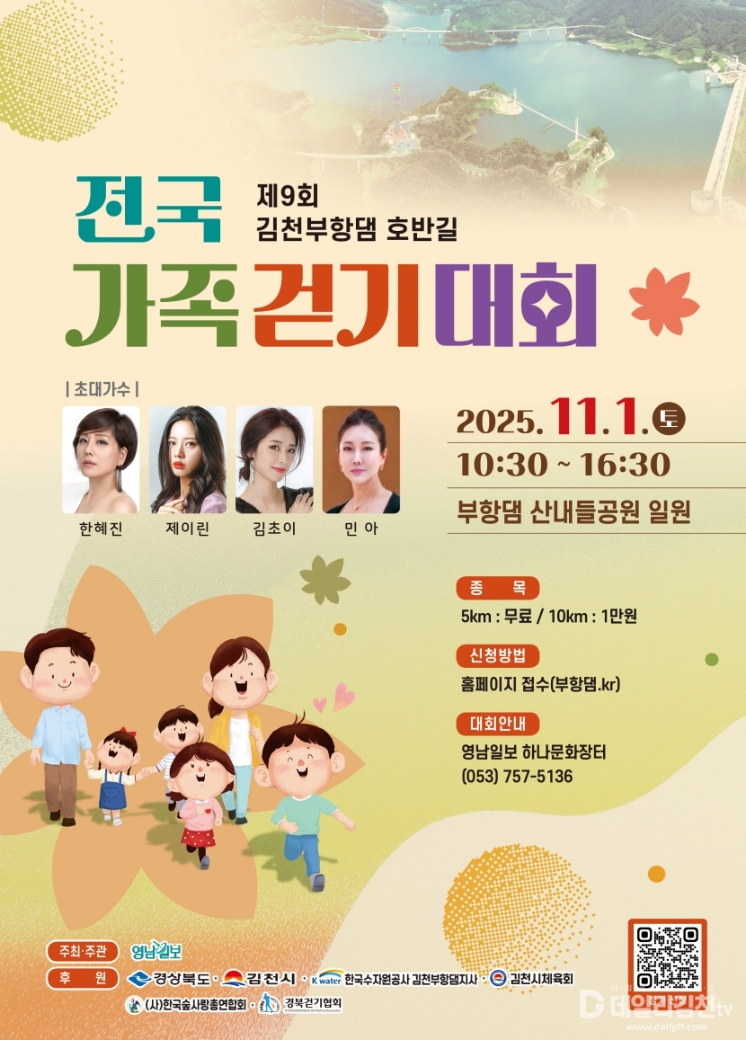 손중일 건강증진과장은 “이번 대회는 걷고, 쉬고, 즐기고, 추억까지 남길 수 있는 가족 나들이형 축제”라며, “부항댐의 가을 절경 속에서 가족과 함께 특별한 하루를 보내시길 바란다”라고 전했다.