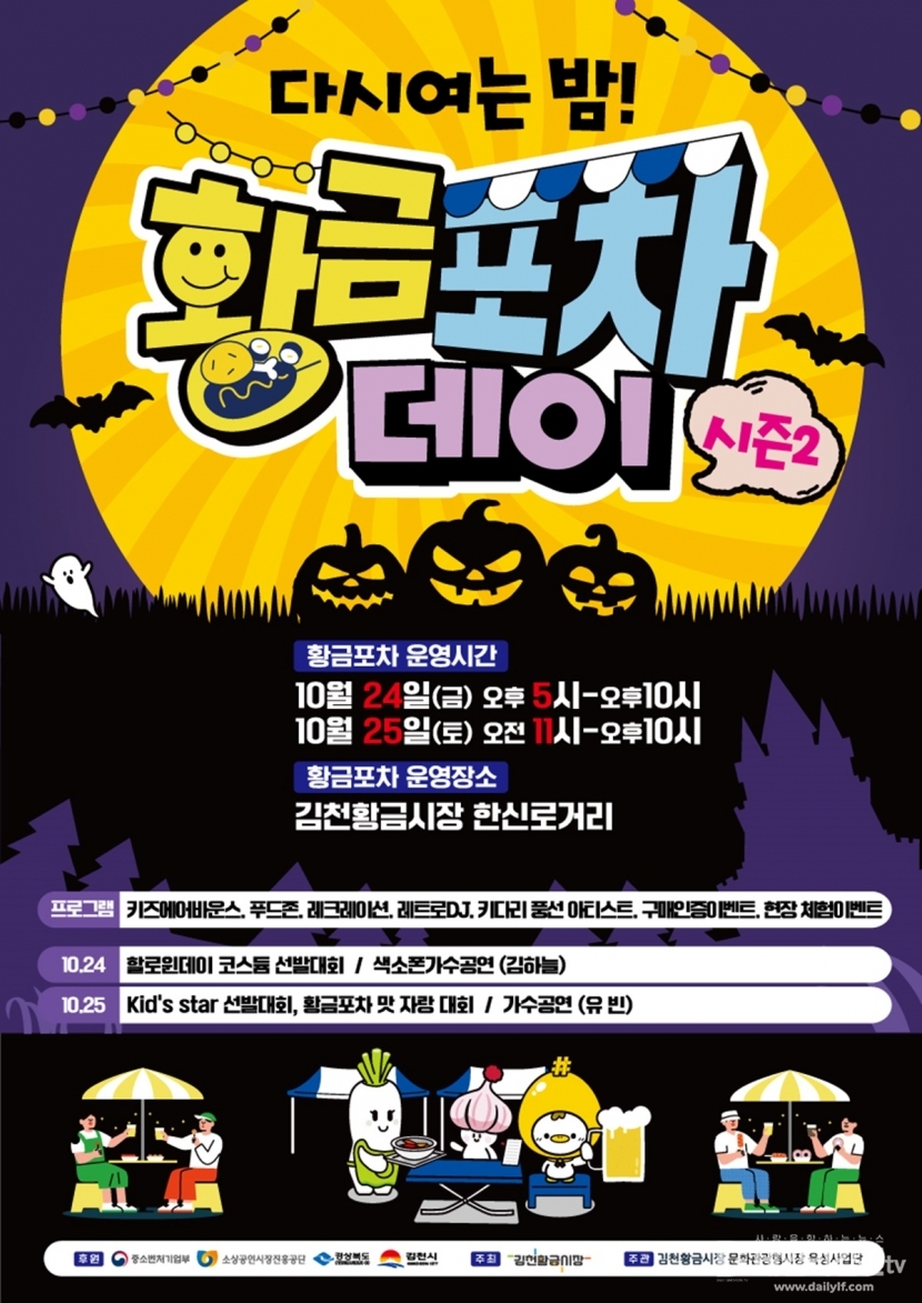 ‘황금포차 데이’는 지난 6월 성황리에 마친 시즌1에 이어 열리는 행사로, 황금시장 한신로 일원에서 26개 먹거리 부스와 공연, 어린이 체험행사 등이 다채롭게 꾸며진다.