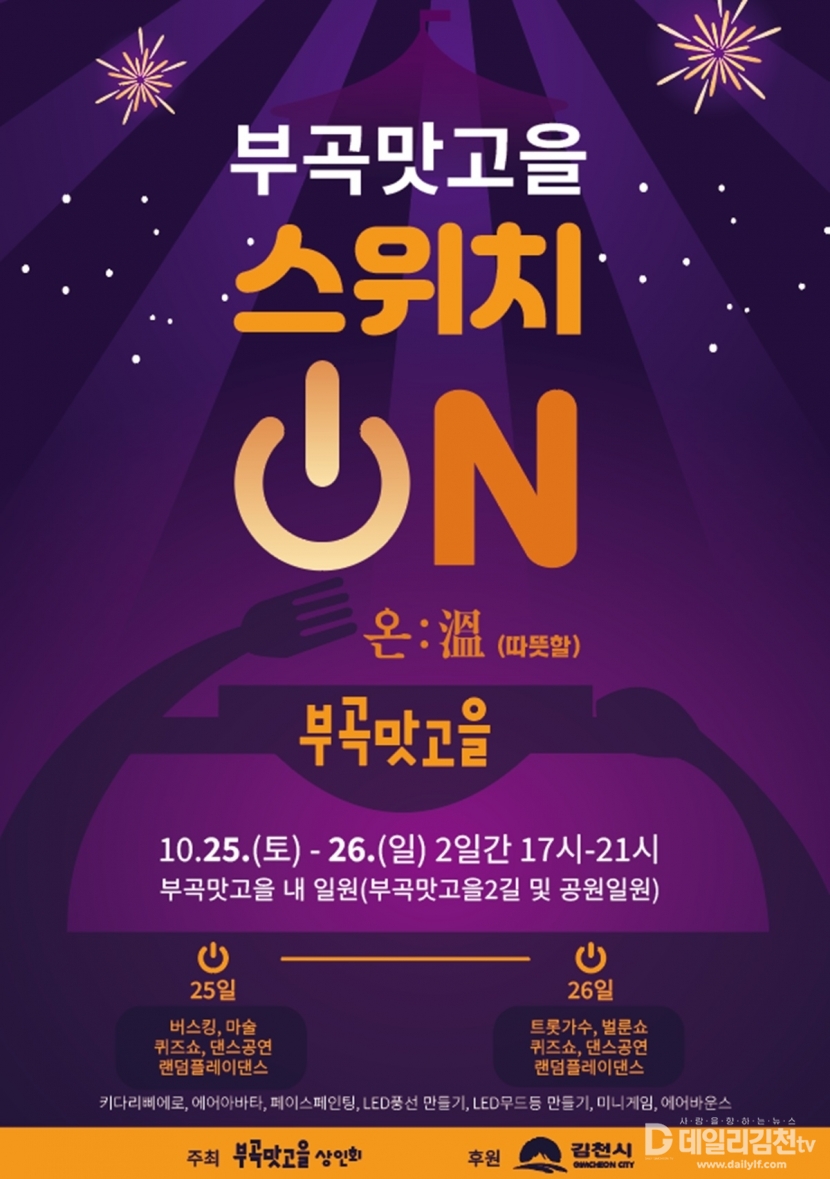김천시(시장 배낙호)에서는 황금시장상인회(회장 박선광)가 24~25일 ‘다시 여는 밤, 황금포차 데이’를, 부곡맛고을상인회(회장 김동건)가 25~26일 ‘부곡맛고을 축제, 스위치 온’을 각각 개최한다고 밝혔다.