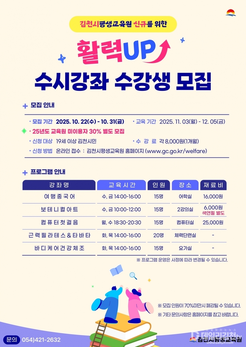 김천시평생교육원은 시민들의 일상에 배움의 활력을 불어넣을‘활력 UP 수시 강좌’를 개설하여, 오는 22일부터 31일까지 수강생 모집에 나선다.