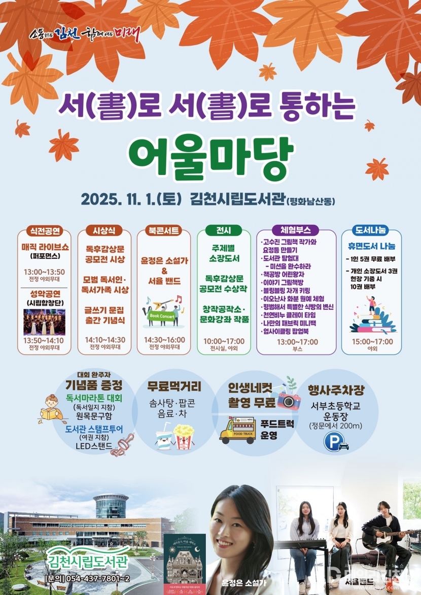 행사와 관련한 자세한 사항은 시립도서관 누리집(www.gcl.go.kr)을 참조하거나 운영팀(054-421-2844)으로 문의하면 된다.