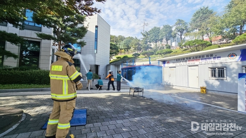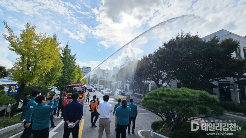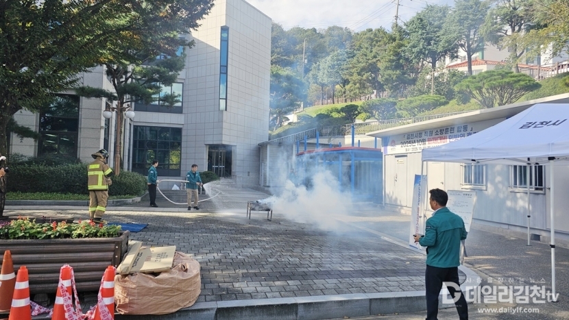 김천시(시장 배낙호)는 23일 오후 2시 청사 화재에 대응하기 위해 대광119안전센터와 합동 소방 훈련을 시행했다.