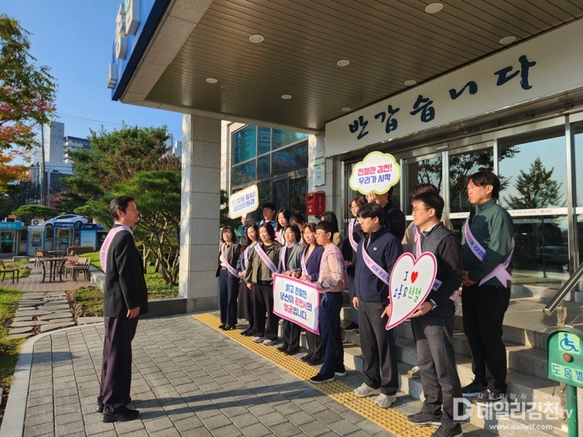 김천시 열린민원과는 지난 29일 시청 1층 종합민원실 앞 전정에서 직원 30여 명이 참석한 가운데 친절·청렴 실천 교육 및 캠페인을 펼쳤다.