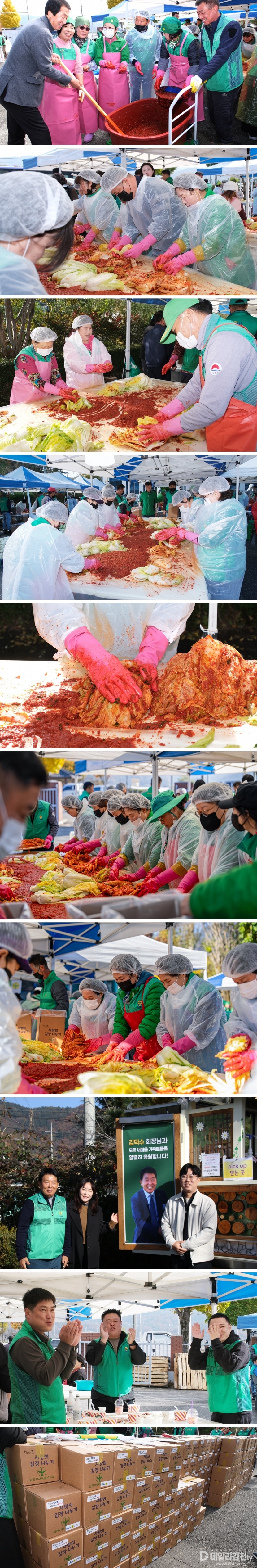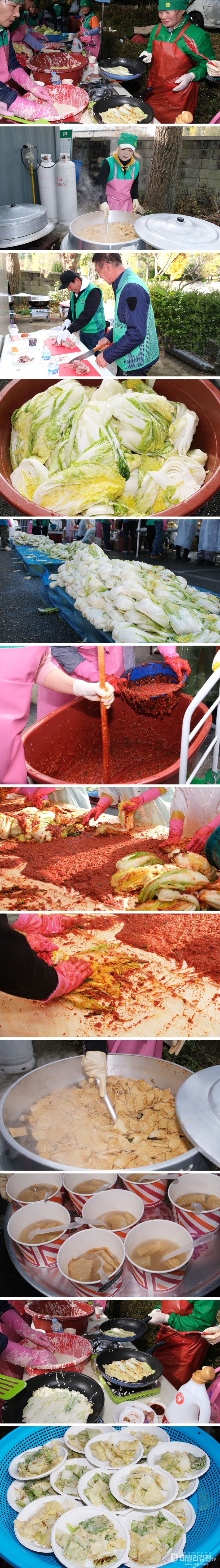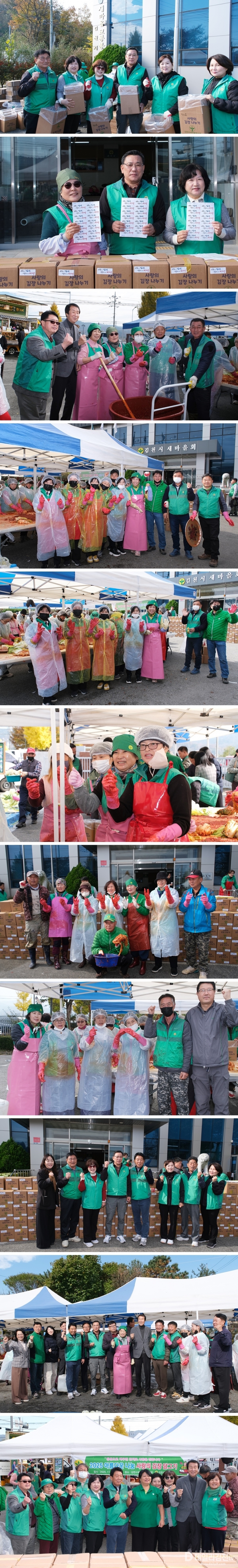 어려운 사정 탓에 김장을 하지 못하는 이웃에게 김치와 따뜻한 마음을 나누기 위해 마련된 이번 행사에는 쌀쌀한 날씨임에도 불구하고 읍면동 협의회·부녀회원들과 새마을문고, 직공장새마을운동김천시협의회, 청년새마을연대 등 100여 명의 새마을 회원들이 참석했다. 이들은 맛있는 김치를 전달하기 위해 서로 격려하며 열심히 봉사에 임했다. 11일에는 김장에 앞서 재료 손질을 했으며, 12일에는 본격적으로 버무리기 및 포장을 한 후 관내 복지기관에 전달했다.