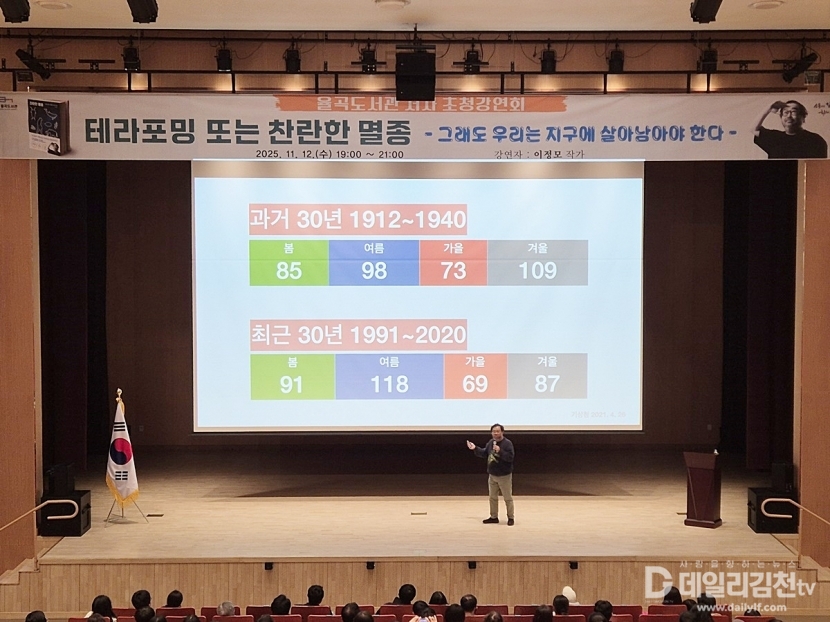 이신기 김천시립도서관장은 “이번 강연은 과학과 인문학이 만나는 뜻깊은 자리였다.”라며 “앞으로도 도서관이 지구의 위기를 외면하지 않고, 함께 해결책을 모색하는 시민 교양의 장으로서 역할을 다하겠다.”라고 말했다.