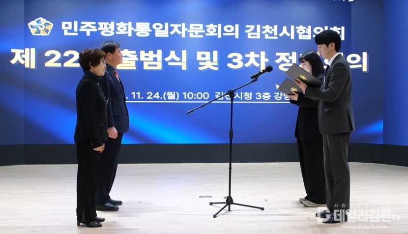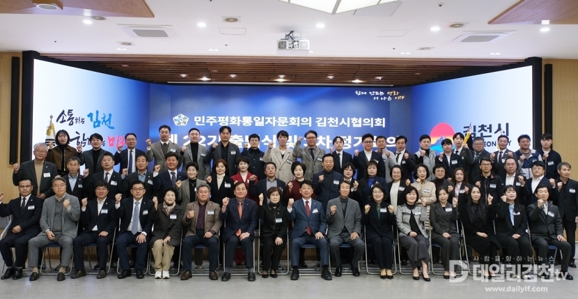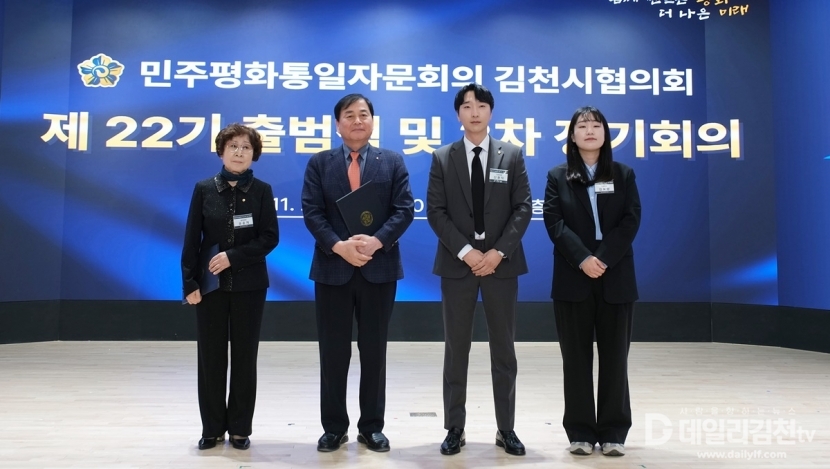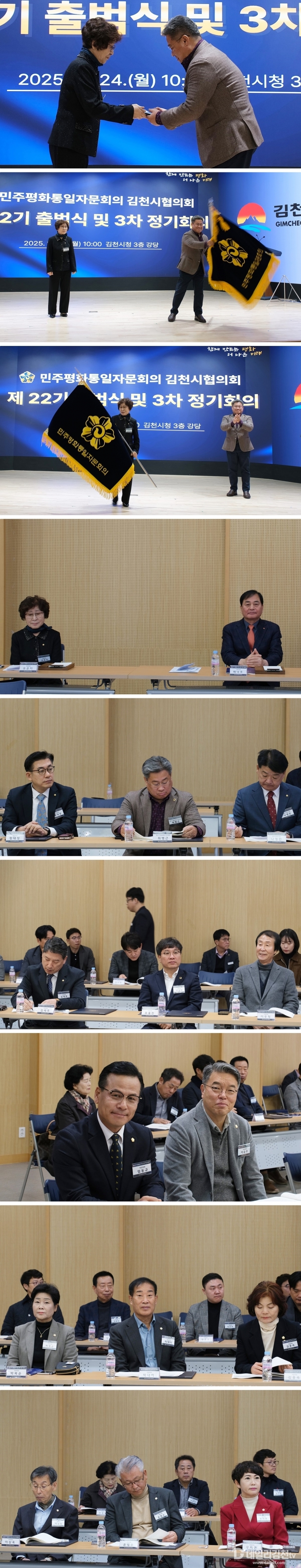제22기 민주평화통일자문회의 김천시협의회가 24일 오전 10시 김천시청 강당에서 출범식 및 3차 정기회의를 열고 공식 활동에 들어갔다. 협의회는 향후 2년간의 활동 목표를 ‘국민과 함께 만드는 평화 공존과 공동 성장’으로 제시하며 새로운 출발을 알렸다.