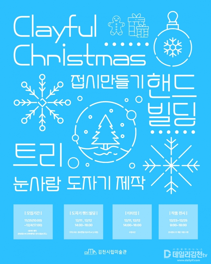 김천시시설관리공단(이사장 김재광)이 운영하는 김천시립미술관의 겨울 도예 체험 프로그램 〈Clayful Christmas〉가 예약 오픈과 동시에 큰 관심을 모으며 30초 만에 회차가 매진되는 높은 호응을 얻었다.