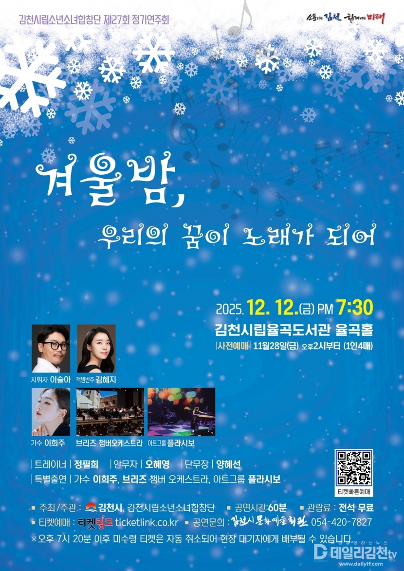 김천시문화예술회관은 12월 12일 금요일 오후 7시 30분에 김천시립율곡도서관 율곡홀에서 시립소년소녀합창단 제27회 정기연주회를 개최한다.