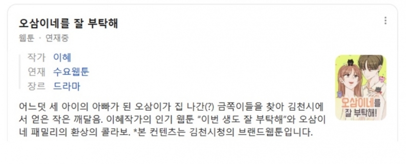 김영택 김천시 문화홍보실장은 “오삼이 가족 웹툰은 김천의 정서와 특색을 스토리로 풀어낸 프로젝트”라며 “따뜻하고 유쾌한 가족 이야기를 통해 김천시의 이미지를 전국적으로 알리는 계기가 되길 바란다”라고 전했다.