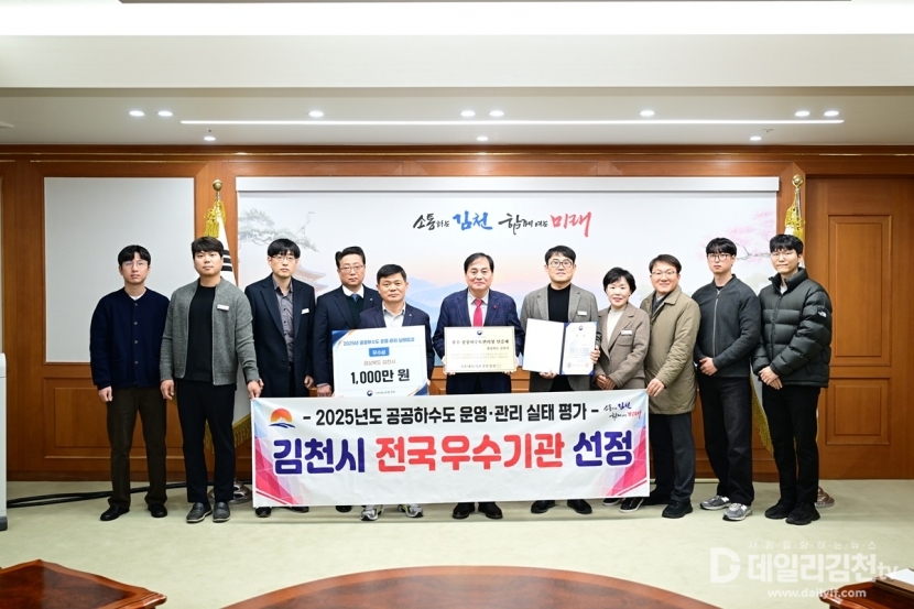 김천시는 지난 27일 하수도 연찬회 시상식에서 기후에너지환경부가 주관하는 ‘2025년도 전국 공공하수도 운영 ․ 관리 실태 평가’에서 우수기관으로 선정돼 인증패와 포상금 천만 원을 수여받았다고 밝혔다.