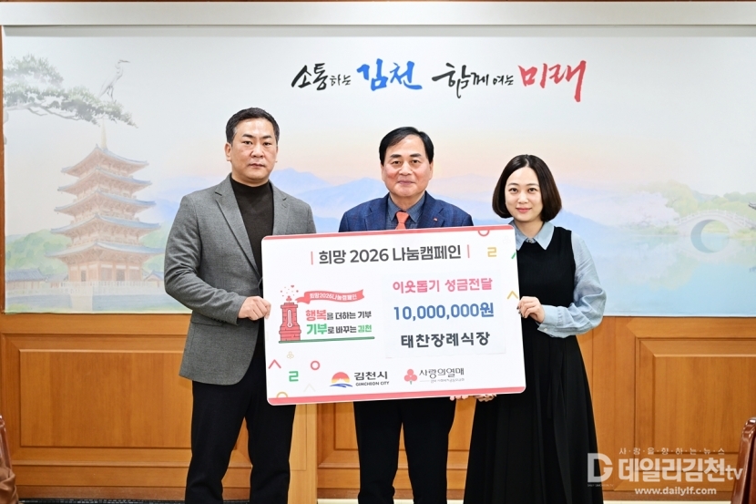 김천시(시장 배낙호)는 지난 1일 태찬장례식장(대표 전정훈·전은지)이 이웃돕기 성금 1,000만 원을 전달하며 희망2026나눔캠페인‘김천 1호’ 기부자가 됐다고 밝혔다.