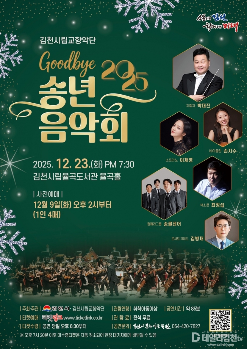 김천시 문화예술회관은 오는 23일 오후 7시 30분 시립율곡도서관 2층 율곡홀에서 2025년 한 해의 마무리를 장식할 시립교향악단 송년음악회를 개최한다고 밝혔다.
