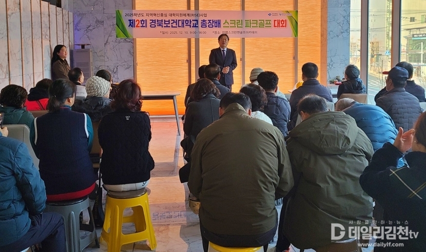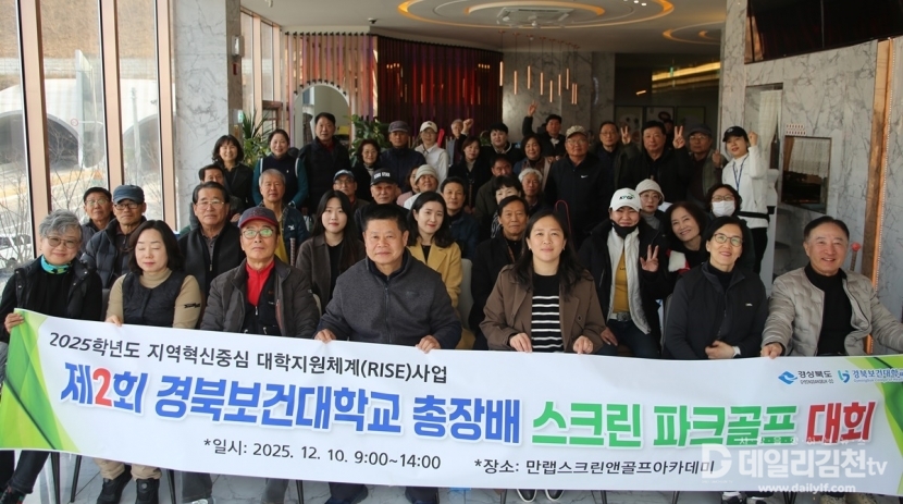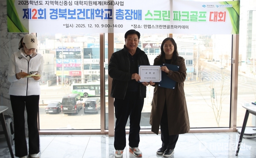 경북보건대학교(총장 이은직)는 10일 오전 9시 만랩스크린골프아카데미에서 ‘제2회 경북보건대학교 총장배 스크린 파크골프대회’를 개최하며 겨울 추위 속에서도 열띤 화합과 경쟁의 장을 마련했다. 이번 대회는 2025학년도 지역혁신중심 대학지원체계(RISE) 사업의 일환으로 진행됐다.