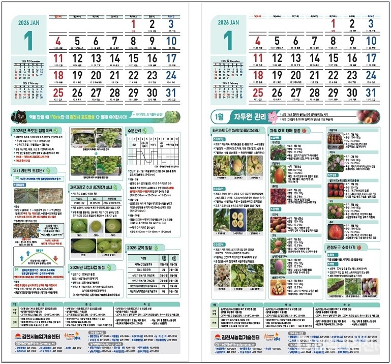 이번에 제작된 재배 매뉴얼 달력은 샤인머스켓 5,500부, 자두 3,500부로, 김천시에 주소를 두고 농업경영체로 등록된 포도·자두 재배 농가를 대상으로 배부된다. 달력은 농업인이 영농 현장에서 시기별로 필요한 정보를 손쉽게 확인할 수 있도록 실용성과 가독성을 높인 벽걸이형으로 제작되었다.