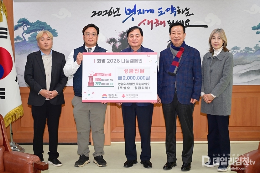 배낙호 김천시장은 “어려운 경제 여건 속에서도 따뜻한 나눔을 실천해 주신 농업회사법인 두성바이오에 깊이 감사드린다”라며 “기탁해 주신 성금은 도움이 절실한 이웃들에게 소중히 전달하겠다”라고 전했다.