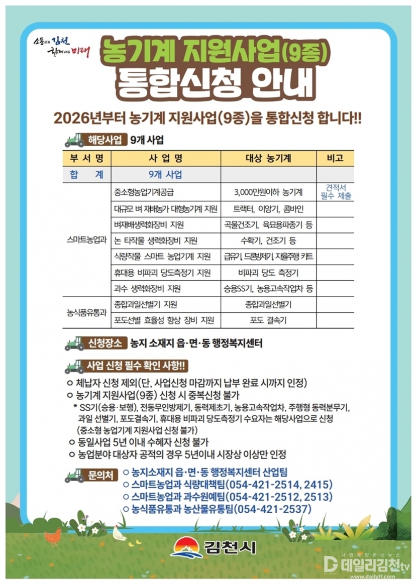 김천시(시장 배낙호)는 지역 농업인을 대상으로 2026년 농기계 지원사업(9종) 신청을 이달 30일까지 농지소재지 읍면동 행정복지센터에서 접수한다고 밝혔다.