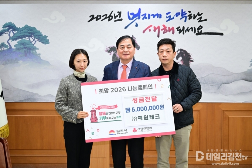 김천시(시장 배낙호)는 지난 15일 ㈜예원테크(대표 정재욱)로부터 희망2026나눔캠페인 성금 500만 원을 전달받았다고 밝혔다.