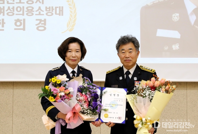 김천소방서(서장 송영환)는 지난 19일 대회의실에서 김천소방서 의용소방대 여성연합회장 임명장 및 퇴임 대장 공로패 수여식을 개최했다.