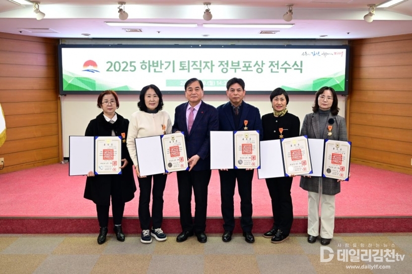 김천시(시장 배낙호)는 지난 19일 시청 2층 회의실에서 ‘2025년 하반기 퇴직 공무원 정부포상 전수식’을 개최했다.