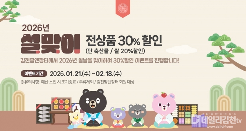 김천시(시장 배낙호)는 설 명절을 맞아 농특산물 판로 확대와 농가의 부가가치 향상 및 소득 증대를 도모하기 위해, 1월 21일부터 2월 18일까지 시 대표 농특산물 온라인 쇼핑몰 ‘김천팜앤장터’에서 전 상품 할인 행사를 진행한다.