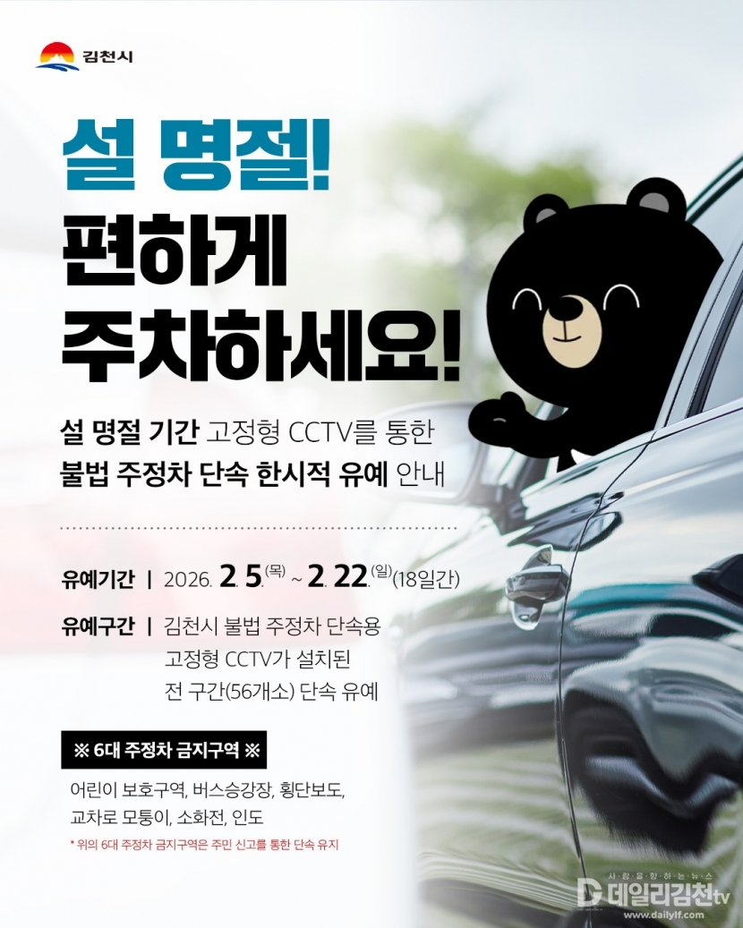 김천시(시장 배낙호)는 2월 5일부터 2월 22일까지 18일간 설 명절 기간 주정차 단속 카메라가 있는 전 구간(56개소)에 대하여, 고정형 카메라 를 통한 불법 주정차 단속을 한시적으로 유예한다.