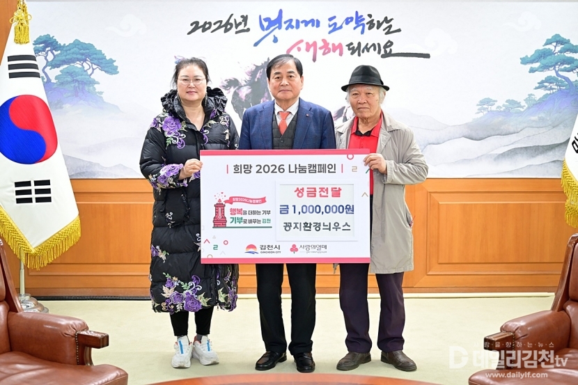 김천시(시장 배낙호)는 지난 28일 꽁지환경늬우스(대표 이재용)로부터 희망2026나눔캠페인 성금 100만 원을 전달받았다고 밝혔다.