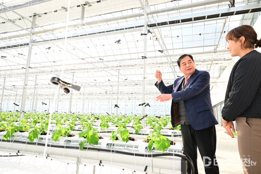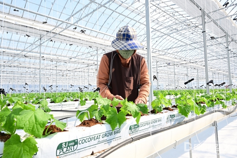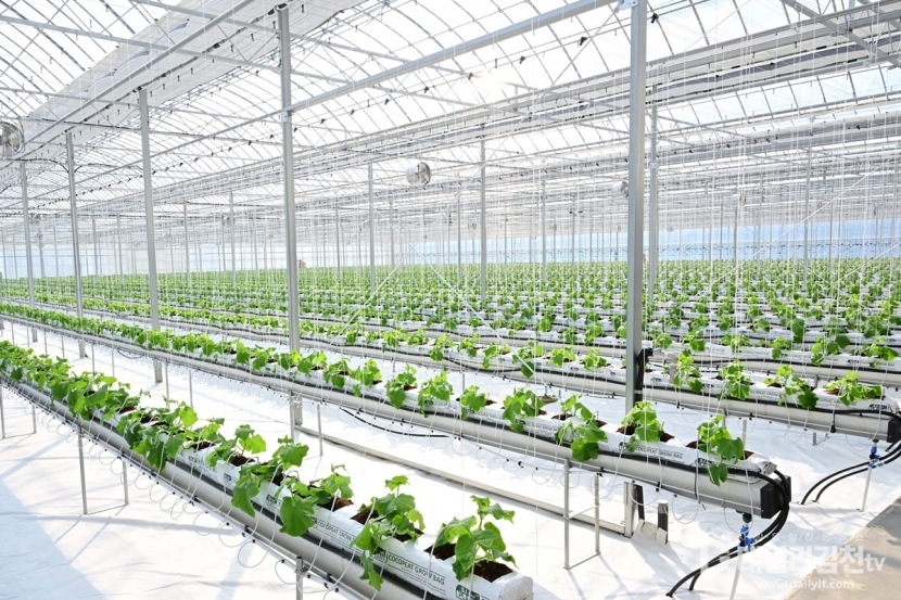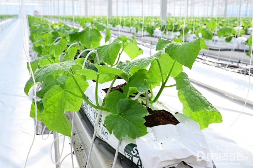 해당 농가는 국비 공모사업 지원을 포함해 총사업비 11억 원을 투입해 4,577㎡ 규모의 스마트팜 온실을 조성했으며, 보온시설, 내·외부 환기시 설, 양액기 등 첨단 스마트팜 설비를 구축하여 오이를 재배하고 있다.