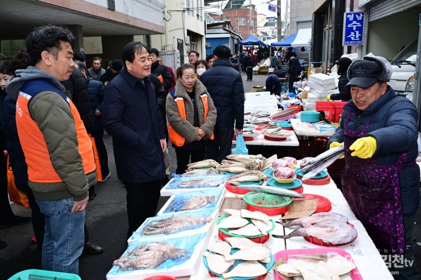 김천시(시장 배낙호)는 설 연휴를 앞두고 물가 상승과 경기 침체로 어려움을 겪고 있는 전통시장 상인들을 격려하고 지역 상권에 활력을 불어넣기 위해 평화시장과 황금시장에서 설맞이 전통시장 장보기 행사를 실시했다.
