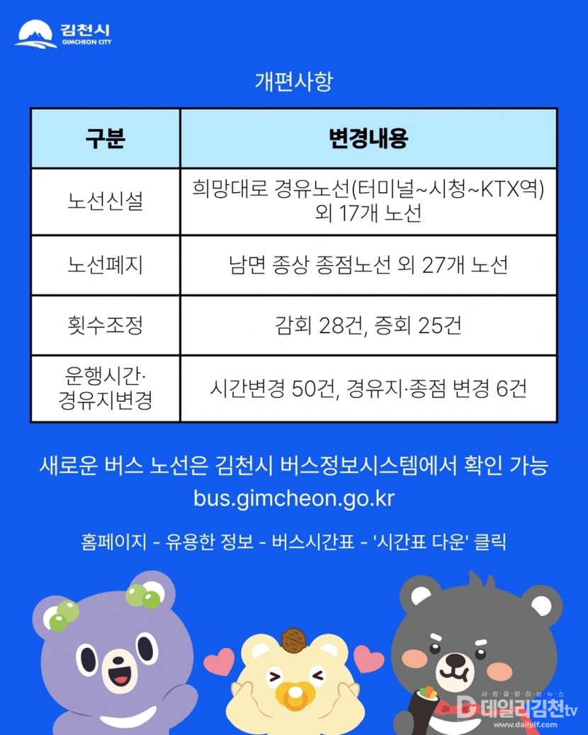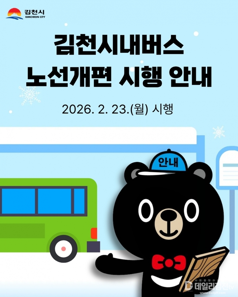 시는 이번 개편으로 대규모 노선 조정이 이루어지는 만큼, 혼선을 방지하기 위해 버스를 이용하는 시민들은 반드시 ‘김천시 버스정보시스템(bus.gimcheon.go.kr)’이나 시청 홈페이지를 통해 변경된 운행 시간표를 사전에 확인할 것을 당부했다.