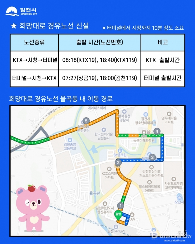 특히, 이번 개편으로 기존에 우회 운행했던 혁신도시(KTX역)~시청~터미널 구간을 최단거리로 연결하는 ‘희망대로’ 노선이 구축되어 혁신도시와 시내권을 잇는 출퇴근길이 더욱 빨라질 전망이다. ‘희망대로’ 노선은 KTX역 출발(08:18, 18:40) 및 터미널 출발(07:27, 18:00) 등 주요 시간대에 집중 배차되어 출퇴근 시민과 KTX 이용객의 불편을 대폭 해소할 것으로 기대된다.