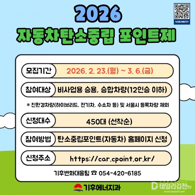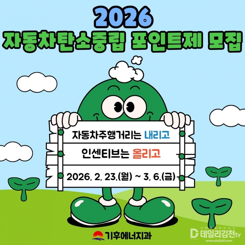 김천시가 시민들의 자발적인 온실가스 감축을 유도하기 위해 「2026년 자동차 탄소중립포인트제」참여 차량 450대를 오는 2월 23일부터 3월 6일까지 선착순 모집한다고 밝혔다.