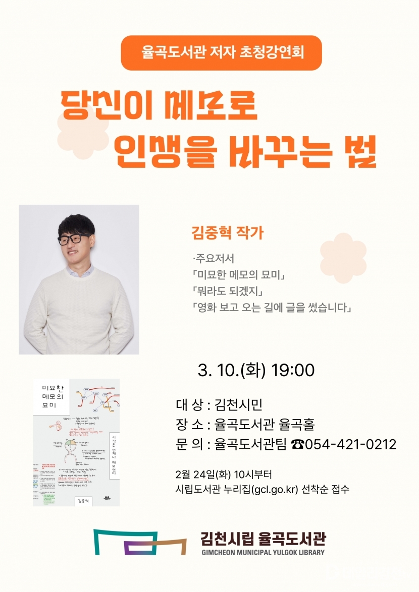‘저자 초청 강연회’는 김천 출신의 「김중혁」 작가, 2025년 베스트셀러 「안녕이라 그랬어」의 저자 「김애란」 작가 등 문학 작가 및 분야별 저명인사를 초청해 독서의 공유가치에 흥미를 더할 계획이다. 또한, 시민이 함께 참여하는 문화 행사로 공동체 유대감을 형성하고, 도서관의 문화 거점 기능은 더욱 강화될 것으로 보인다.